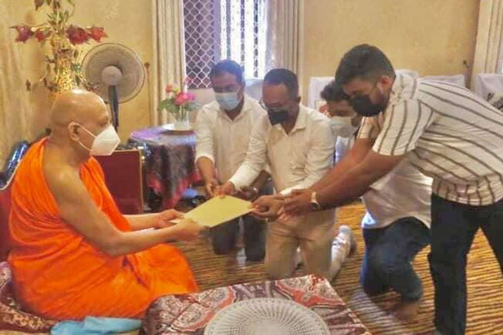 Youths of the GotaGoHome Public Struggle today (03) have paid homage to the Chief Prelates of the Malwathu – Asgiri Chapters and handed over a communique,’ urging them to dismiss the titles bestowed upon the Rajapaksa family and issue a Sangha Commandment.