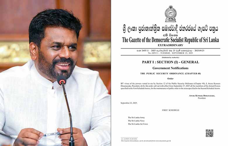 September 25, Colombo (LNW): President Anura Kumara Dissanayake has issued an Extraordinary Gazette calling upon the armed forces to be mobilised across the country in support of maintaining public order and security, Parliament was informed today (25).