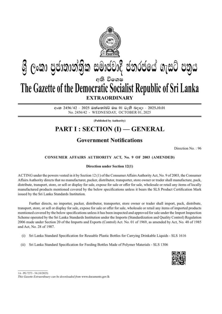 The Consumer Affairs Authority (CAA) has announced that all reusable plastic bottles and polymer-based feeding bottles will be required to carry Sri Lanka Standards (SLS) certification from April 1, 2026, under a new directive issued through an Extraordinary Gazette on October 1.