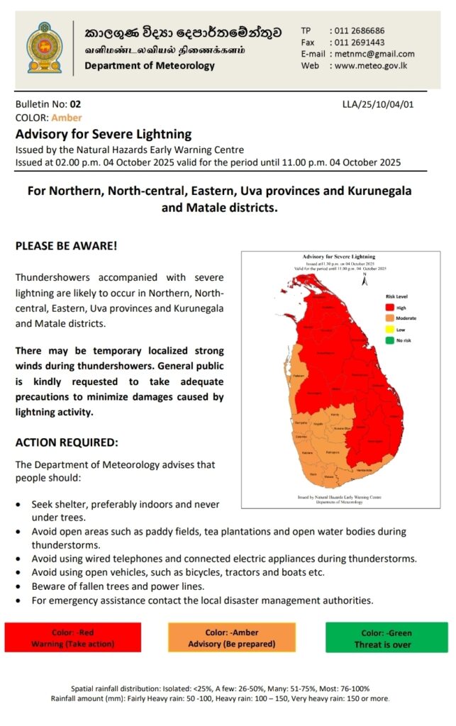 October 04, Colombo (LNW): Thundershowers accompanied with severe lightning are likely to occur in Northern, North-Central, Eastern and Uva Provinces and Kurunegala and Matale Districts, the Natural Hazards Early Warning Centre of the Department of Meteorology said in a warning statement today (04).