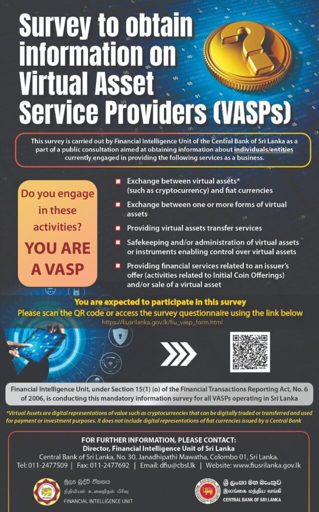 October 06, Colombo (LNW): Sri Lanka’s Financial Intelligence Unit (FIU), operating under the Central Bank, has launched a mandatory survey aimed at identifying individuals and businesses engaged in Virtual Asset Service Provider (VASP) activities.