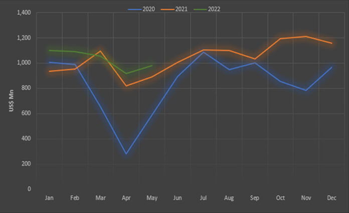 Earnings from merchandise exports in May 2022 increased substantially by 17.5% over the corresponding month in 2021, recording at $ 1,047 million, Central Bank announced.