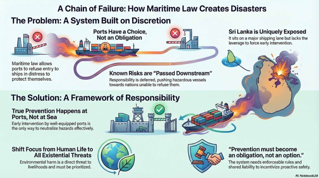 The uncomfortable lesson of X-Press Pearl is that prevention in maritime disasters does not happen at sea — it happens at ports. Decisions taken days or weeks earlier, in different jurisdictions, shape whether a hazard is neutralised quietly or allowed to escalate into catastrophe.