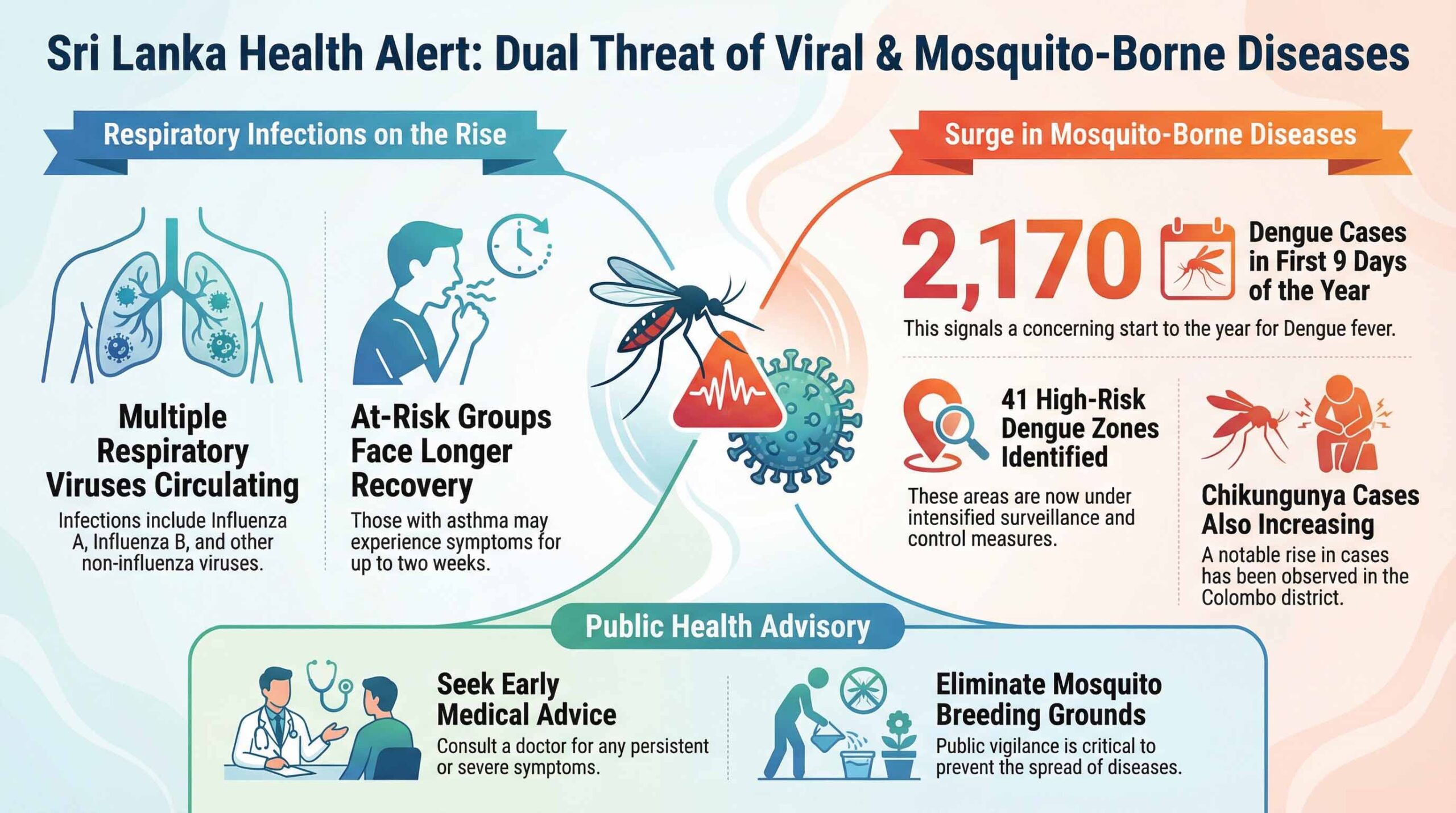 January 11, Colombo (LNW): Medical authorities have raised concerns over a recent uptick in viral illnesses across the country, noting a clear increase in infections affecting the respiratory system as well as mosquito-borne diseases.