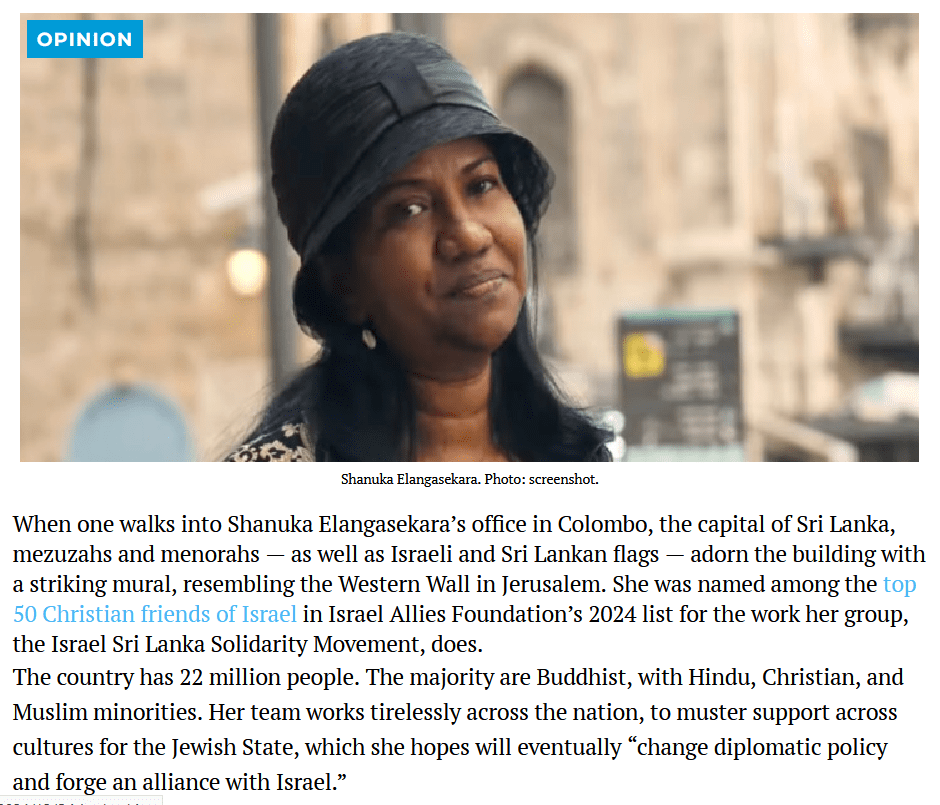 Shanuka Ilangasekara, chairperson of the “Mothers Movement,” also leads the Israel Sri Lanka Solidarity Movement (ISSOM), an organisation created to strengthen relations between Israel and Sri Lanka. She is a vocal advocate for recognising Israel as a separate state in the context of the ongoing Israel–Palestine conflict.