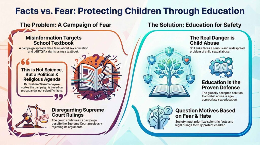 However, she emphasised that a child in Sri Lanka is sexually abused every two hours, that child sexual abuse ranks as the third most common crime in the country, and that 40,000 complaints remain unresolved. In this context, she underlined that age-appropriate sexuality education is globally recognised as the only effective measure to prevent sexual crimes.