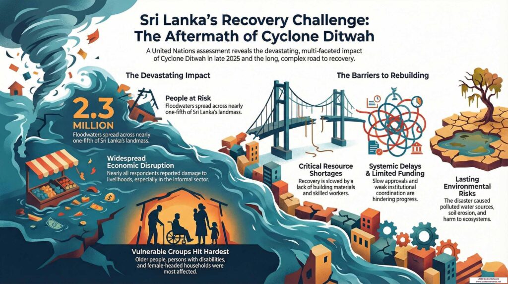 January 15, Colombo (LNW): A newly released United Nations Development Programme (UNDP) review has painted a stark picture of the damage left by Cyclone Ditwah, showing that almost every community in the worst-hit parts of Sri Lanka has suffered harm to homes, roads and essential services, with rebuilding needs stretching far beyond immediate relief.