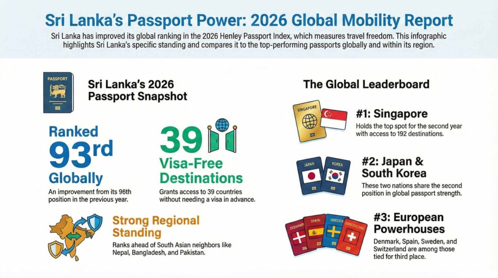 January 15, Colombo (LNW): Sri Lanka has recorded a modest rise in global travel freedom, moving up to 93rd place in the Henley Passport Index 2026, which assesses the relative strength of passports around the world. According to the newly released rankings, Sri Lankan passport holders can now access 39 destinations without securing a visa in advance.