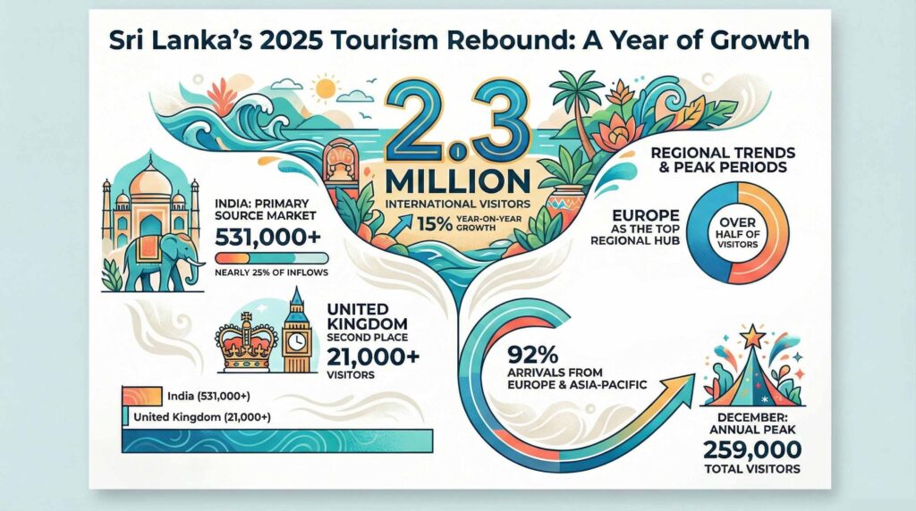 January 18, Colombo (LNW): Sri Lanka’s tourism sector recorded a strong performance in 2025, welcoming approximately 2.3 million international visitors over the course of the year, according to newly released official statistics.