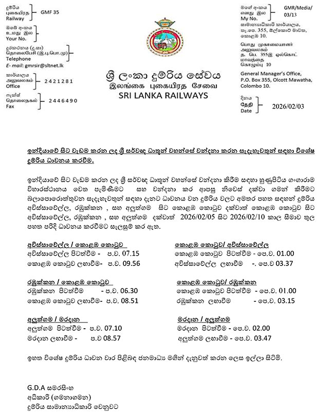 According to the Department, in addition to the regular train services currently in operation, special trains will operate from Avissawella, Rambukkana and Aluthgama to Colombo Fort, as well as return services from Colombo Fort to Avissawella, Rambukkana and Aluthgama, from February 5 to February 10.