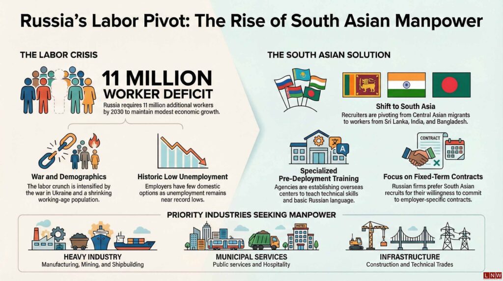 February 08, Colombo (LNW): Sri Lanka is increasingly coming into focus as Russia turns to South Asia to address one of the most severe labour shortages it has faced in decades, driven by demographic decline and the prolonged war in Ukraine.