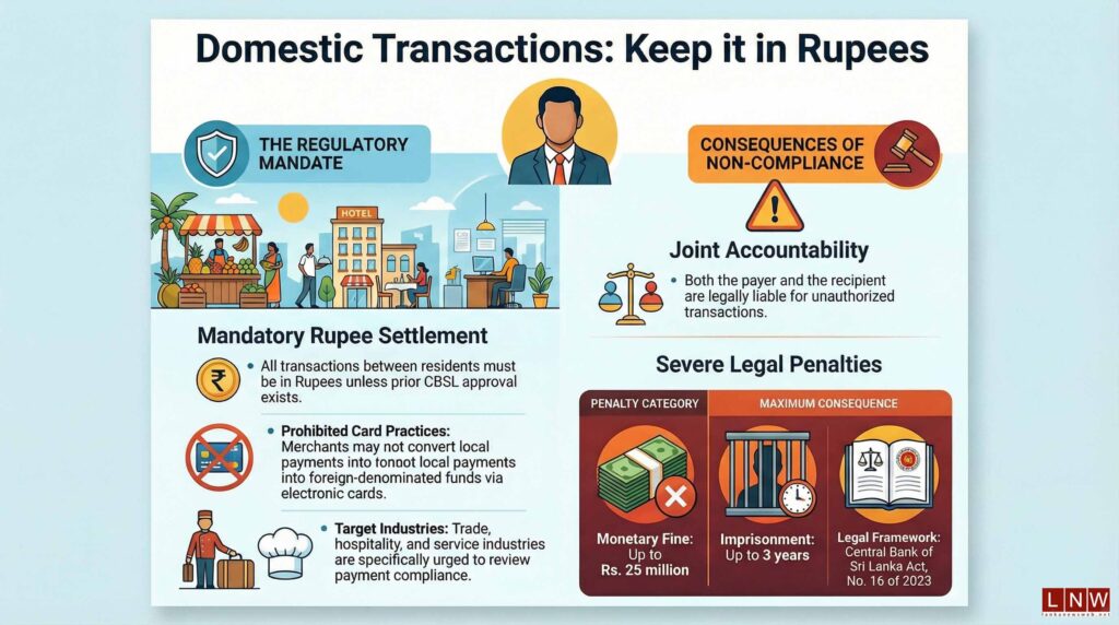 The CBSL further made clear that it has not authorised merchants to accept payments from local customers in foreign currency by converting rupee payments into foreign-denominated funds, including through electronic fund transfer cards such as credit and debit cards. Any arrangement that results in a domestic payment being credited to a Foreign Currency Account without explicit approval is deemed unlawful.