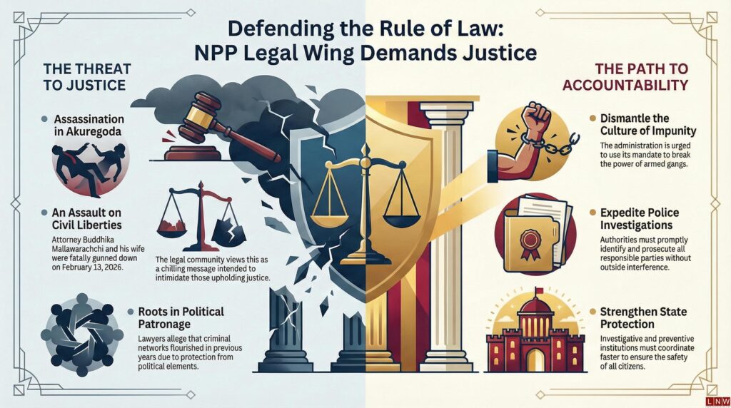 February 15, Colombo (LNW): The legal professionals affiliated with the National People’s Power (NPP) have strongly denounced the fatal shooting of attorney-at-law Buddhika Mallawarachchi and his wife in Akuregoda, Thalangama, describing the attack as a grave assault on the rule of law.