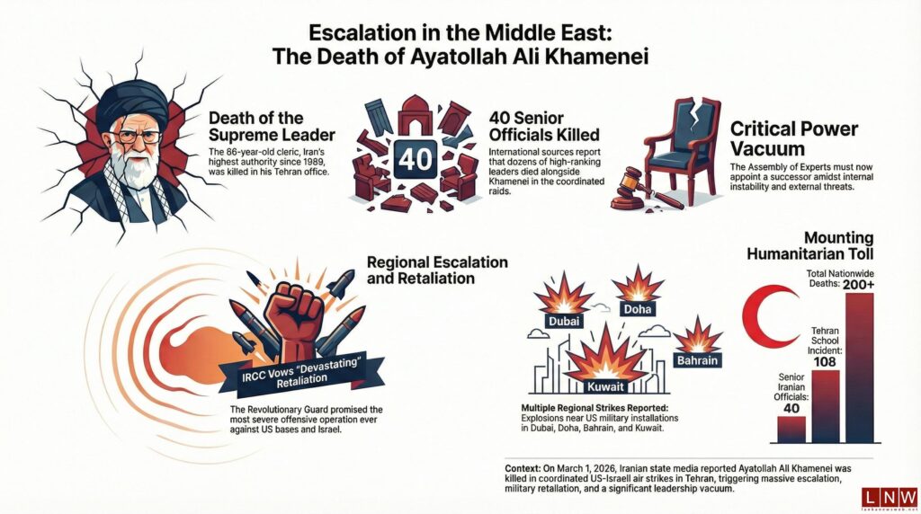 March 01, World (LNW): Ayatollah Ali Khamenei, Iran’s Supreme Leader, has been killed in US-Israeli air strikes on Tehran, according to Iranian state media.