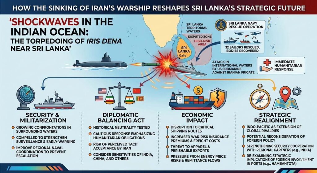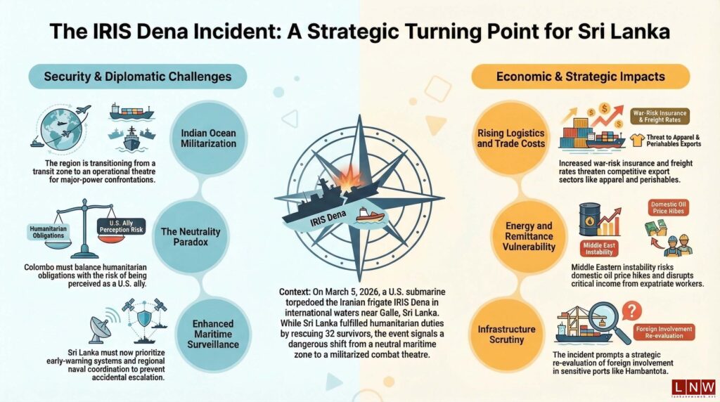 March 05, Colombo (LNW): The torpedoing of the Iranian warship IRIS Dena in the Indian Ocean near Sri Lanka represents a dramatic extension of Middle Eastern hostilities into the wider Indo-Pacific. Although the attack did not occur within Sri Lanka’s territorial waters, the incident has immediate and potentially far-reaching implications for the island’s security posture, diplomatic balancing, and economic stability.