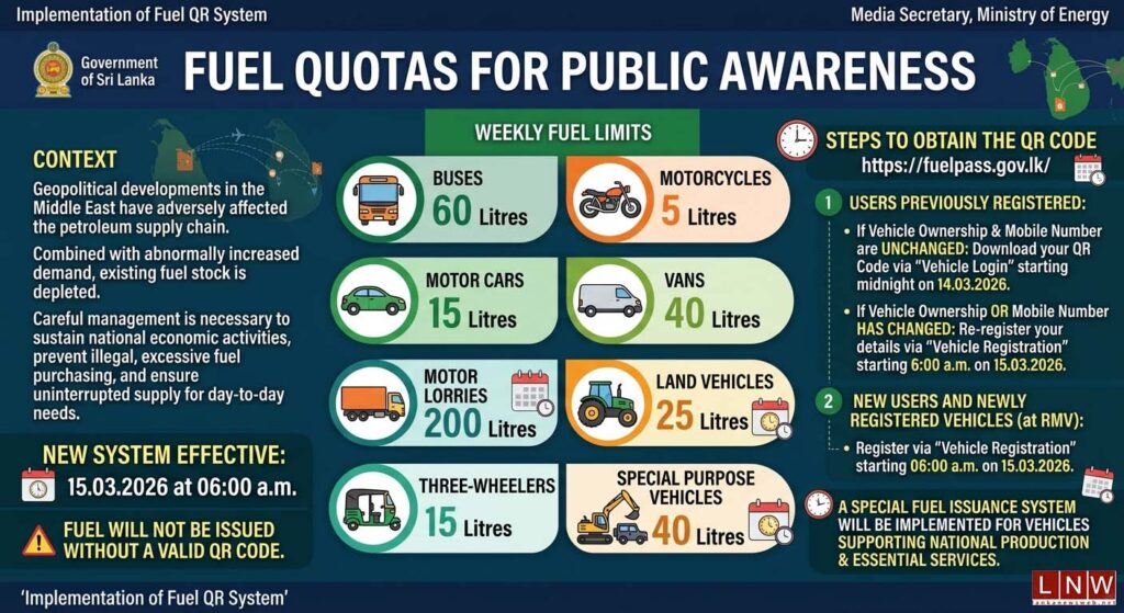 March 15, Colombo (LNW): Sri Lanka is preparing to introduce a renewed QR code system for fuel distribution as mounting geopolitical tensions in the Middle East continue to disrupt global petroleum supply routes.