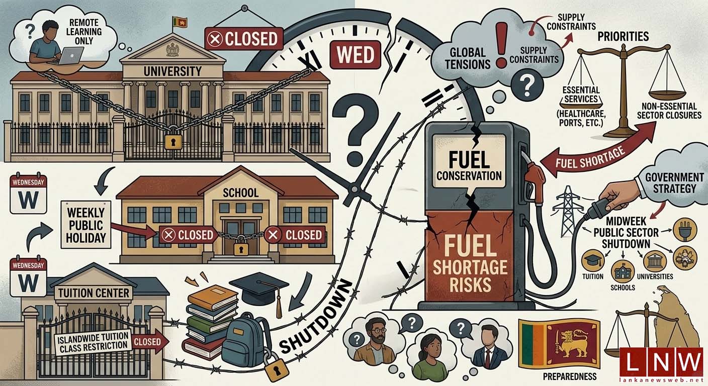 March 17, Colombo (LNW): Private tuition classes across Sri Lanka will not be permitted on Wednesdays, now designated as a weekly public holiday, as part of a wider effort to curb fuel consumption, authorities have announced.