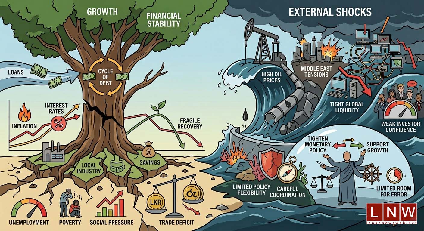 Dr. Wijewardena notes that this could create a dangerous policy dilemma. While the Central Bank may need to tighten monetary policy to control inflation, such actions could simultaneously slow economic growth especially in a context where fiscal policy has limited flexibility.