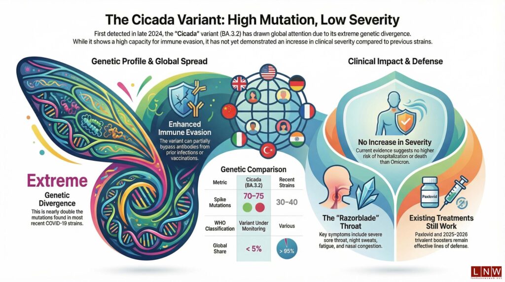 Despite the growing scrutiny, experts caution against alarm. Current evidence suggests that while Cicada is highly mutated and potentially more capable of evading immunity, it does not appear to cause more severe illness than earlier variants such as Delta or Omicron.