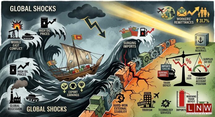 April 02, Colombo (LNW): Sri Lanka’s external sector, which showed signs of recovery in 2025, is once again under pressure as global geopolitical tensions begin to erode its current account position. The sharp narrowing of the current account surplus in February 2026 signals that the country’s տնտեսական stability remains highly exposed to external shocks.