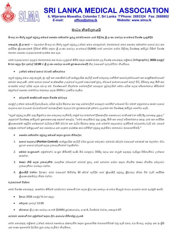 April 06, Colombo (LNW): The Sri Lanka Medical Association (SLMA) has launched a nationwide health awareness initiative ahead of the Sinhala and Tamil New Year, encouraging the public to adopt more balanced eating habits and remain physically active during the festive season.