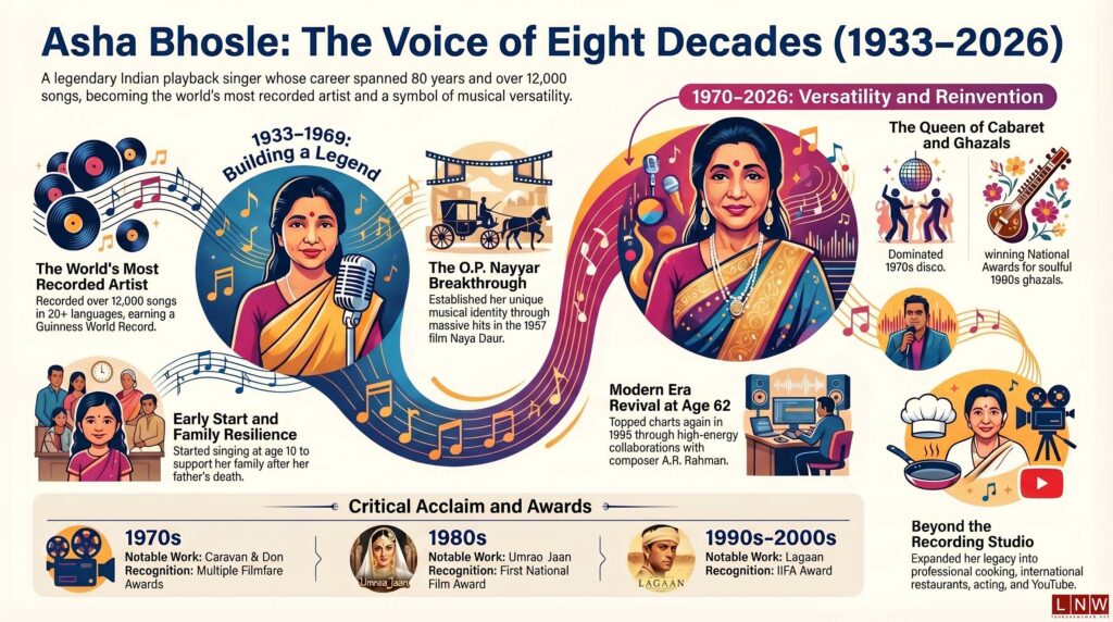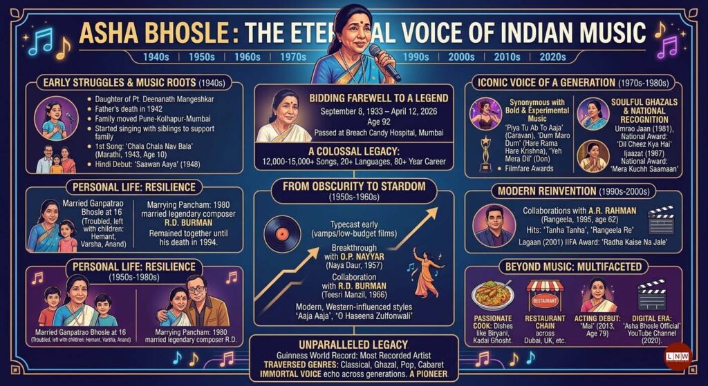 April 12, World (LNW): The world of music bid farewell to one of its most enduring and versatile voices as Asha Bhosle passed away on April 12, 2026, at the age of 92. She died at Breach Candy Hospital in Mumbai after being admitted a day earlier with extreme exhaustion and a chest infection. Her son, Anand Bhosle, confirmed that her final rites would be held at Shivaji Park on April 13. With a staggering career spanning over eight decades and more than 12,000–15,000 songs recorded in over 20 languages, she leaves behind an unparalleled musical legacy.