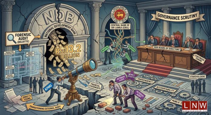 April 27, Colombo (LNW): The Rs. 13.2 billion internal fraud at National Development Bank PLC (NDB) continues to expose critical governance and oversight failures, even as new developments in the bank’s audit framework raise further questions about transparency and accountability. While the forensic audit led by Deloitte Touche Tohmatsu India LLP is underway, recent decisions regarding external and internal audit functions alongside the continued tenure of the same board of directors are intensifying scrutiny.