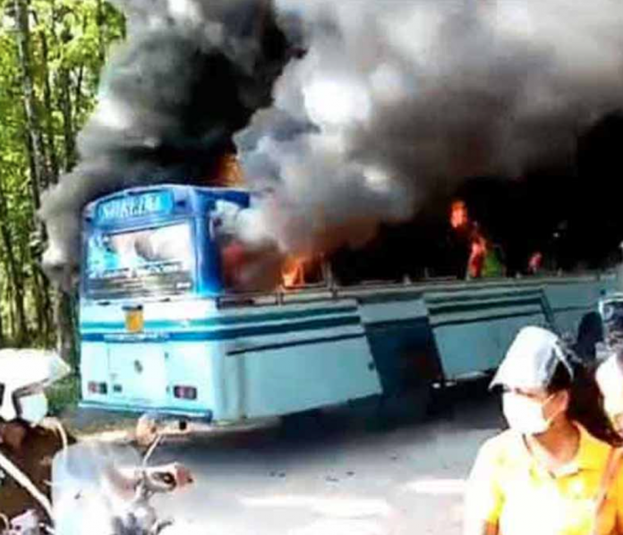 The driver of the bus, which was transporting workers to a factory, had fled after the accident, and relatives of the deceased had set the bus on fire when Avissawella police officers arrived and took the bus into their custody. A police officer who was on the bus at the time was also injured.