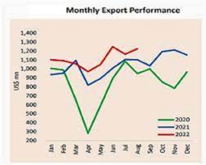 Earnings from merchandise exports grew by 4.3 per cent in September 2022, over September 2021, to US dollars 1,079 million. However, merchandise exports in September 2022 recorded a decline compared to August 2022 (US dollars 1,224 million).
