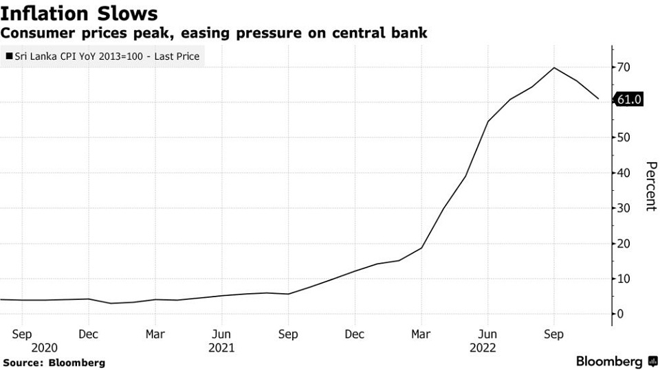 Sri Lanka’s headline inflation based on the Colombo Consumer Price Index (CCPI) for November fell for the second consecutive month to 61.0 percent from 66.0 percent in October as food prices eased off, though the prices of services remained in rather uncertainty, according to the Department of Census and Statistics.