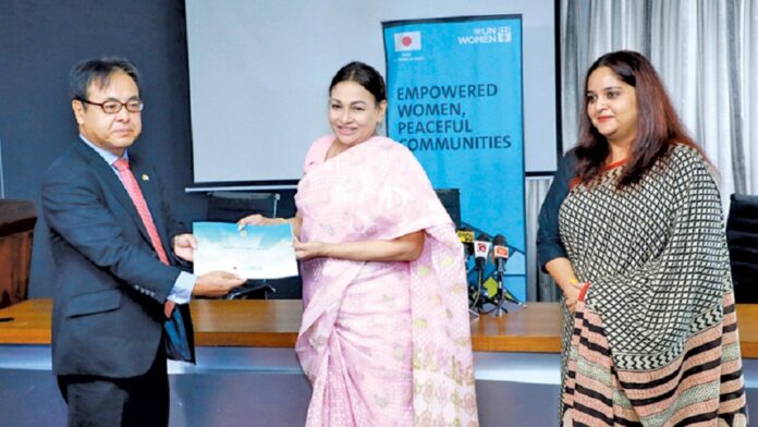 Ambassador of Japan to Sri Lanka Mizukoshi Hideaki and UN Women in Sri Lanka Head Ramaaya Salgado recently presented Sri Lanka’s first-ever National Action Plan on Women, Peace and Security (WPS) to State Minister of Women and Child Affairs Geetha Samanmalee Kumarasinghe.