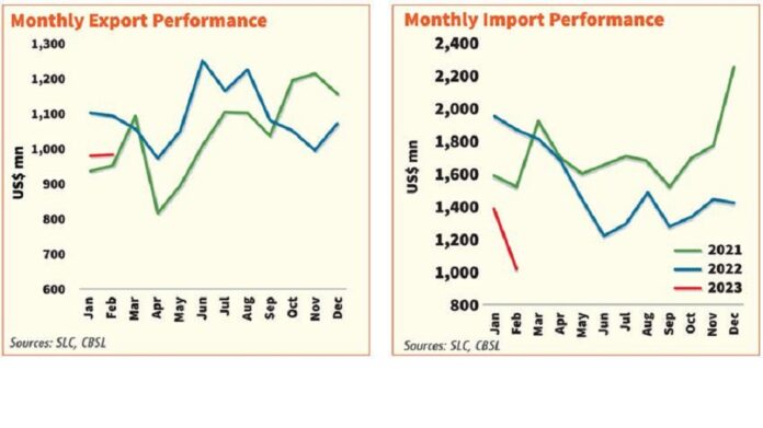 Expenditure on merchandise imports was almost halved in February 2023 at US dollars 1,021 million, compared to February 2022, recording the lowest imports since May 2020.