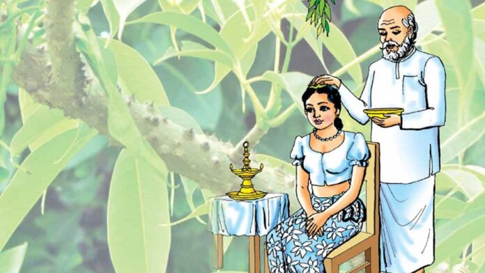 According to Sinhala and Tamil New Year auspicious time calendar, the ceremony is carried out by wearing red and yellow mixed clothing and by seeing at the direction of the South, placing Imbulpath leaves on the head and banyan leaves on the feet, and bathing after being anointed with imbulpath extract and oil.