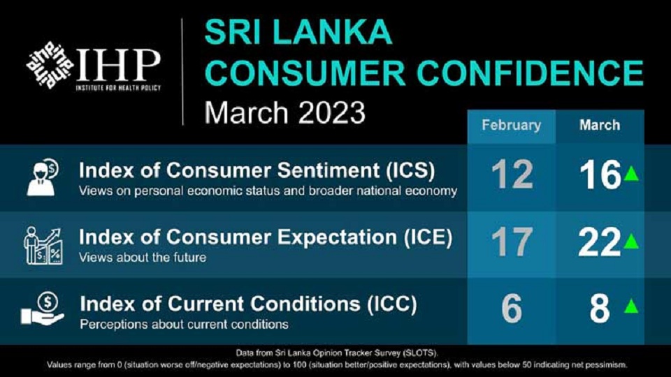 The Institute for Health Policy (IHP) released today the March 2023 update of its Consumer Confidence Indices, which are generated from its Sri Lanka Opinion Tracker Survey (SLOTS).