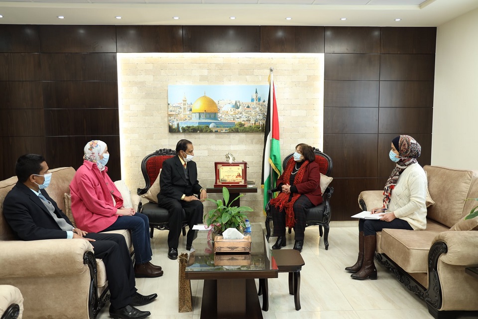 Sri Lanka’s Representative to Palestine, Nawalage Bennet Cooray met with the Minister of Health of the State of Palestine in Ramallah on 20 January 2022 and held discussions on the Covid – 19 situations of both Sri Lanka and Palestine. Dr. Mai Al – Kailah explained the vaccination programme in Palestine and presented facts and figures of the Palestinian people who have received two doses of vaccines as well as booster shots.