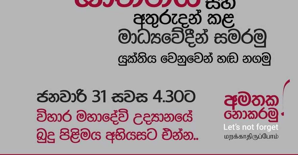 A program titled ‘Let’s not forget’ will be held on January 31 at 4.30 pm in front of the Buduruwa at the Vihara Maha Devi Park, Colombo, in memory of journalists who have been murdered, disappeared and assaulted over the past few decades and called for justice to be done to them.