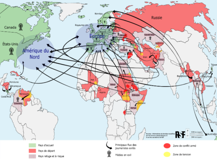 For the first time, Reporters Without Borders (RSF) is publishing a map showing the migratory flows of journalists who are forced to flee their country for safety reasons, and the countries that host exile media. Most of the countries that provide refuge to threatened or persecuted journalists are located in Europe or North America.