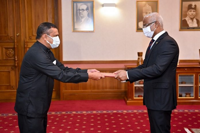 The High Commissioner–designate of Sri Lanka to Maldives, A.M.J. Sadiq presented his Letter of Credence and the Letter of Recall of his predecessor to the President of the Republic of Maldives, Ibrahim Mohamed Solih at the President’s Office in Male´ on 01February 2022.