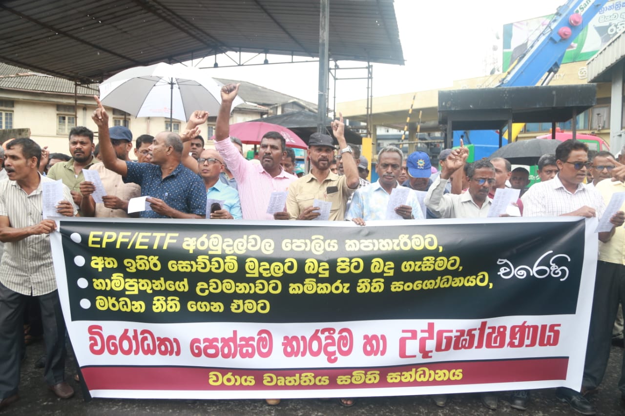 Colombo (LNW): The Dockyard Joint Trade Union Alliance today (06) organised a protest movement against the slashing of interest of the Employees’ Provident Fund (EPF) and the Employees’ Trust Fund (ETF) and the government’s hostile labour law policy and for a number of other demands.