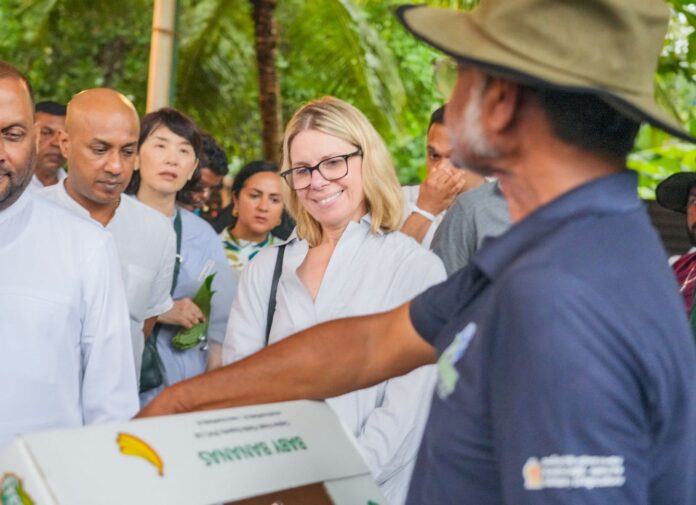 Following her visit to the Climate Smart Farmer Training School (FTS) in Thirappane, Ms. Anna Bjerde and the delegation of officials visited the Ambul Banana Cluster in Rajanganaya.