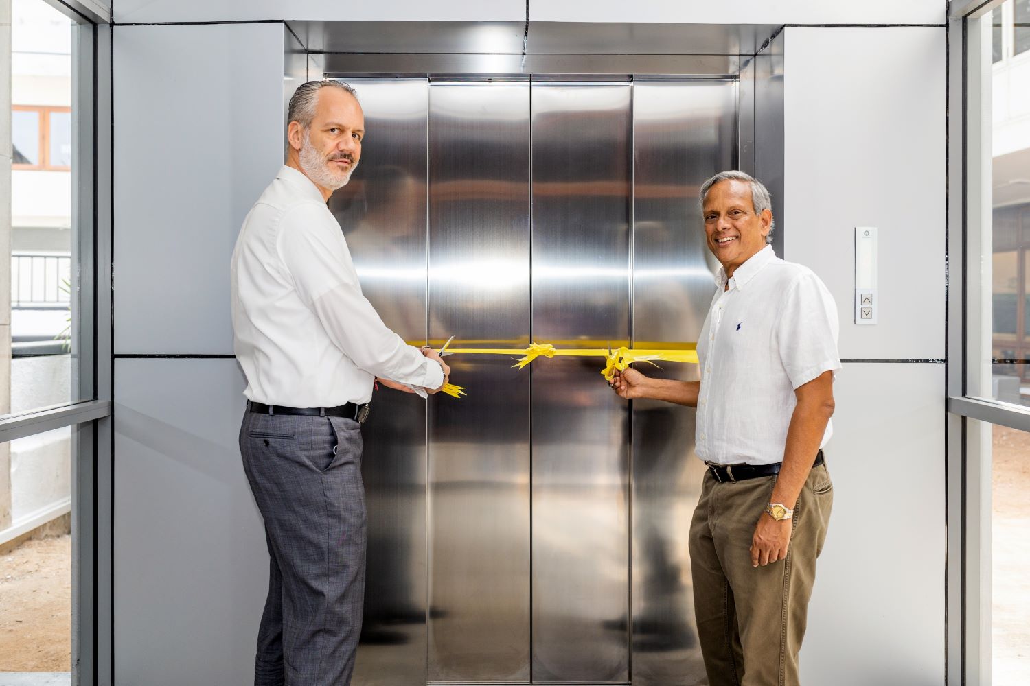 2.Baurs Managing Director/CEO Rolf Blaser (L) seen here cutting the ribbon for the new Schindler elevator