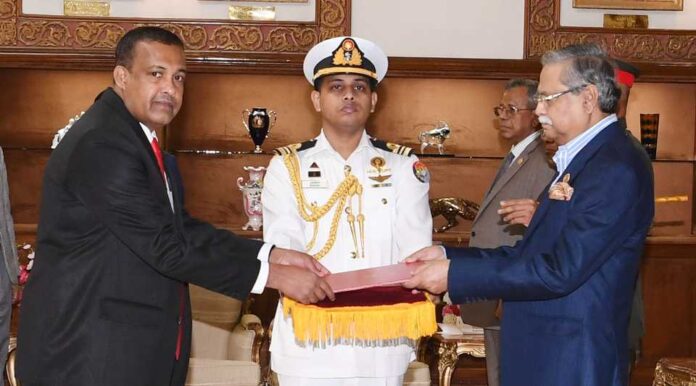 The newly appointed High Commissioner of Sri Lanka in Dhaka, Dharmapala Weerakkody presented Letters of Credence to President Mohammed Shahabuddin of Bangladesh on Thursday, (07) at the Bangabhaban in Dhaka.