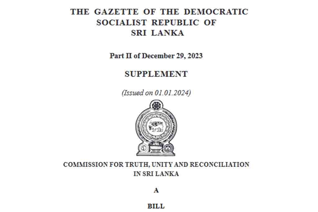 January 02, Colombo (LNW): The government has formally announced the Bill proposing the establishment of the Commission for Truth, Unity, and Reconciliation in Sri Lanka, via gazette.