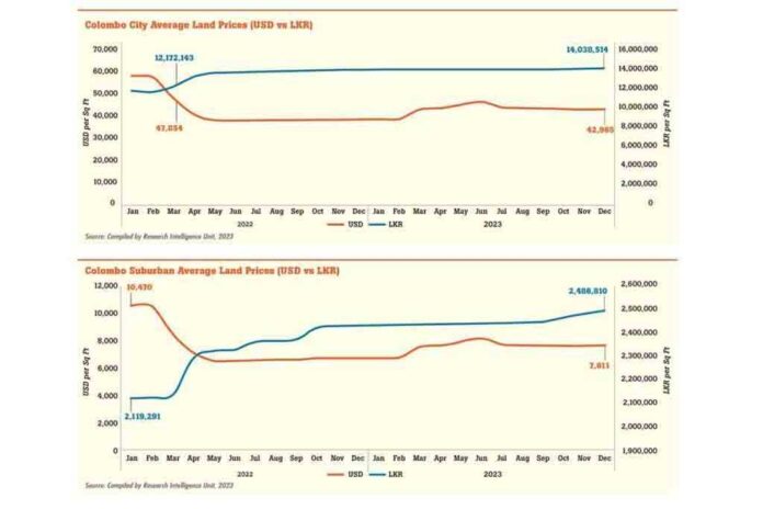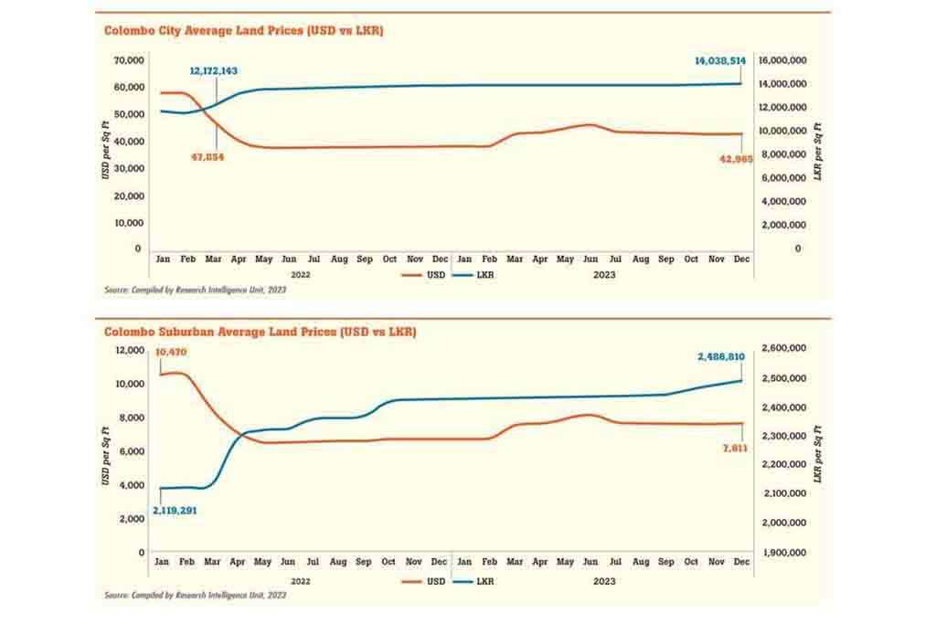 In the suburban areas of Colombo, the trend continued with average land prices in LKR terms rising from Rs. 2.474 million per perch in November to Rs. 2.486 million per perch in December 2023.