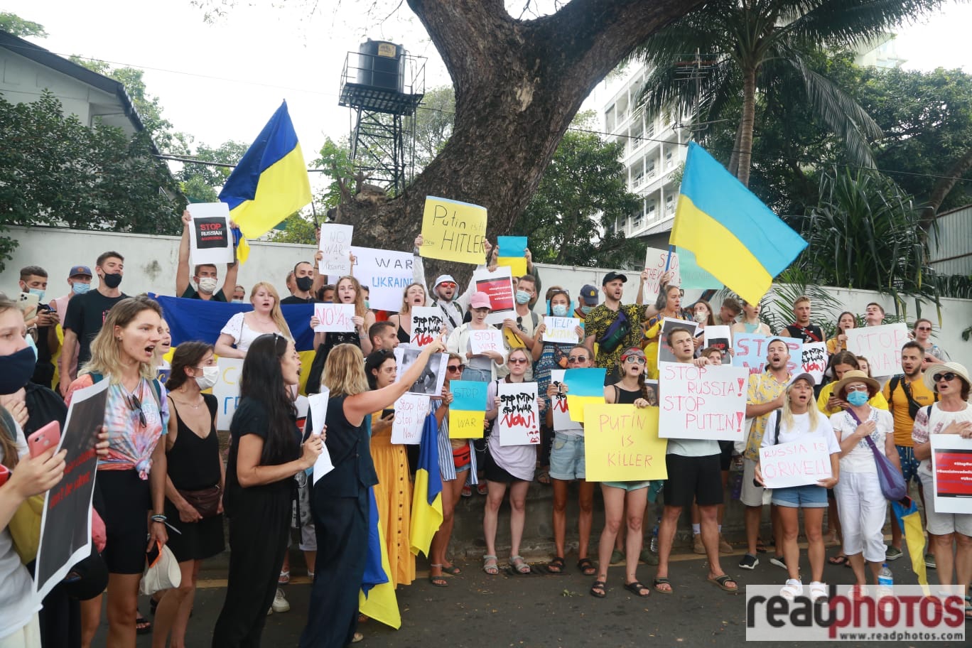 The Ukrainian community in Sri Lanka launched a protest in front of the Russian Embassy in Colombo today against Russia’s invasion of Ukraine which has plunged Europe into a turmoil.