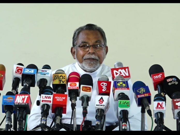 Reverend Father Cyril Gamini speaking to the briefing held at the Archbishop’s House today (28) responded to the claim made by former President Sirisena on the Easter Sunday Massacre, stating that there is no need to swear before the public about his ‘unawareness’ of the attack and that he should be appearing before law and proving his innocence.