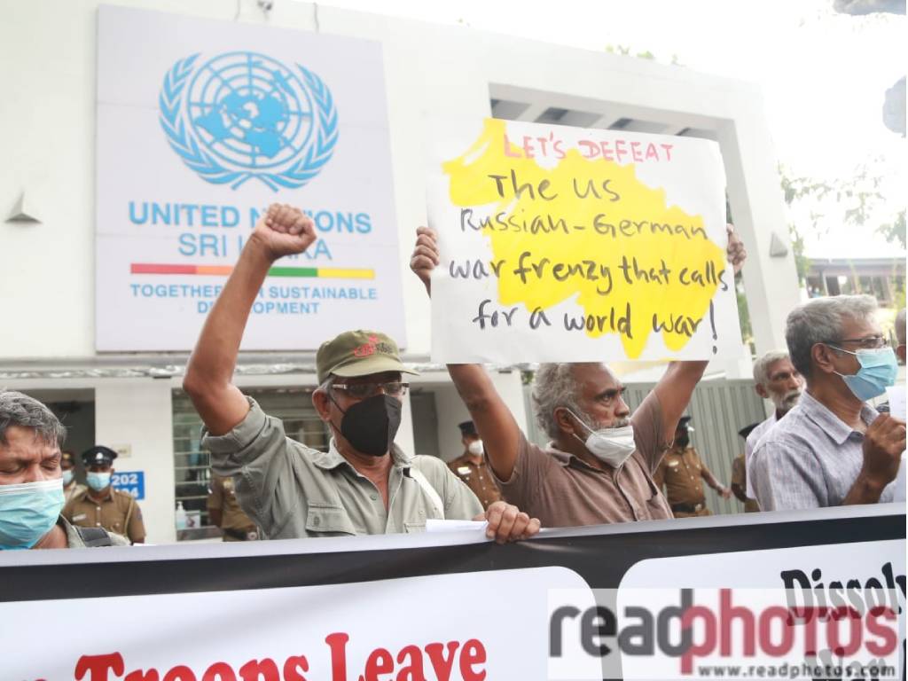 A protest was staged against the Russia’s invasion against Ukraine in front of the United Nations Sri Lanka Office today (02).