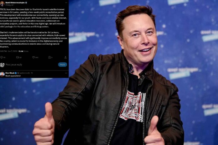 President Ranil Wickremesinghe posted a message on X saying the Telecommunications Regulators Commission of Sri Lanka (TRCSL) has given the green light for Starlink to launch satellite internet services in Sri Lanka, pending a two-week public consultation period.