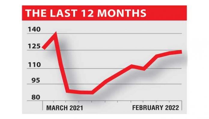 It explains: “The BCI edged up by two basis points from the previous month to register 124 in February, which represents a 10-month high. This means that the unique index is four notches higher than a year ago and a healthy 15 points above its 12-month average of 109.”
