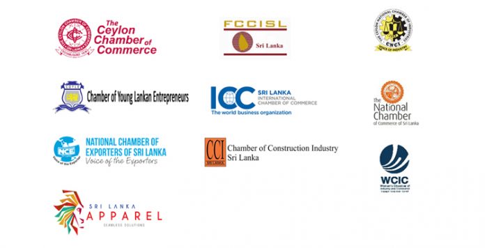 The organisations are Ceylon Chamber of Commerce, Federation of Chambers of Commerce and Industry, Ceylon National Chamber of Industries, Chamber of Young Local Entrepreneurs, ICC Sri Lanka, National Chamber of Commerce, National Chamber of Exporters, Chamber of Construction Industry, Women Chamber of Industry and Commerce, and Sri Lanka Apparel.